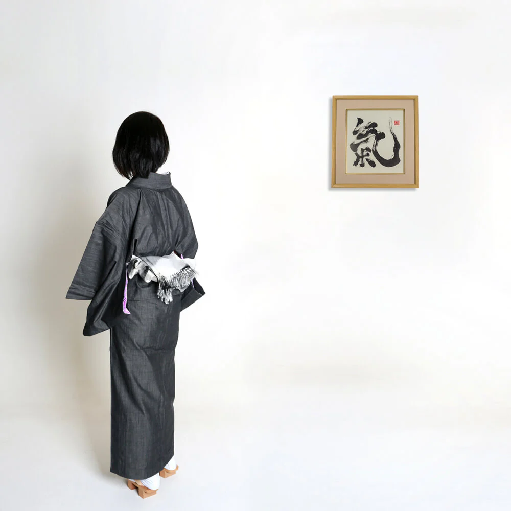 This Calligraphy can be purchased with or without a frame. Framed calligraphy can just as easily be hung in a kotonoma or placed on a table or on the floor at the level of the shomen. Convenient during outdoor training for example. If purchased with a frame, a Kiri engraved box will be offered, if purchased without a frame, the Shikishi will come with a free wooden stand (see photos).