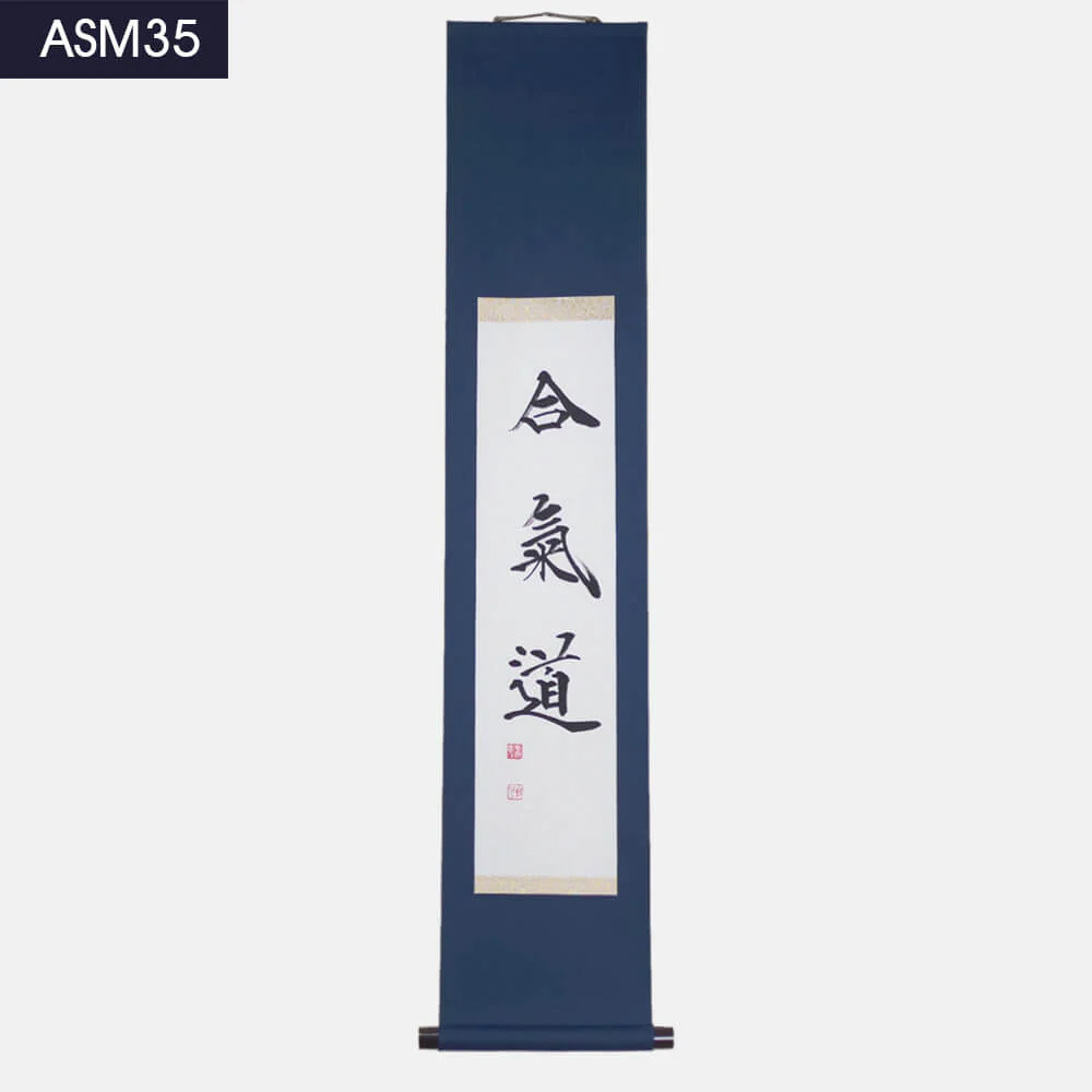 - Sandanhyoso Kakejiku: Divided the same way as Maruhyoso, it differentiates by the "Ichimonji" at both top and bottom of the calligraphy itself. Ichimonji simply means "straight line" and usually refers to a straight strip decorated with a traditional pattern. The Ichimonji part is made of a different fabric. The "Futai", or tassels (two pieces of fabric hanged at the top) are made from the same fabric/pattern as the Ichimonji. Full size: 25 cm x 142 cm.