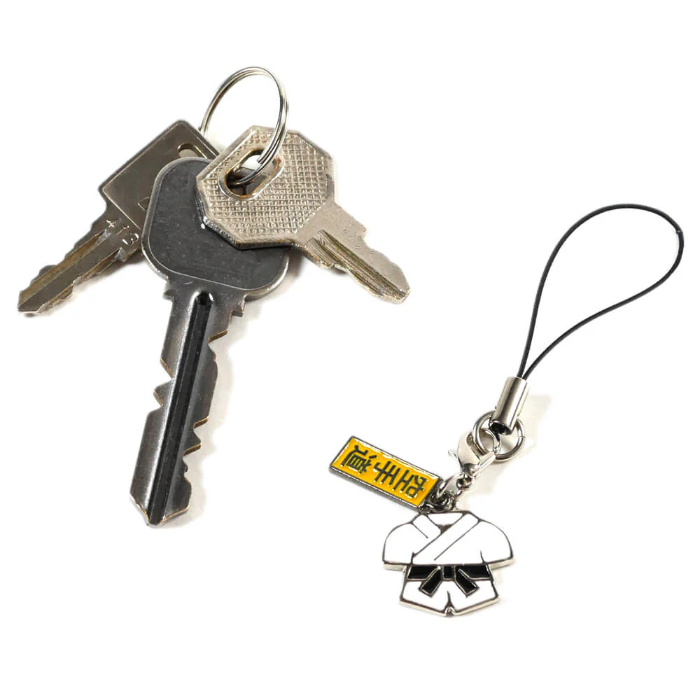 A key holder featuring a white Karategi and a black belt, with a yellow plate displaying the Kanji for Karatedo.